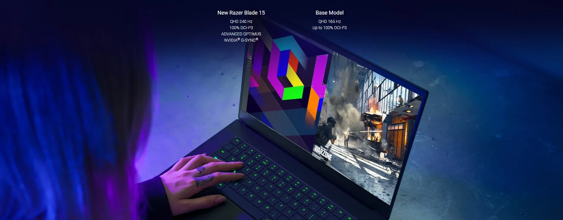 Новейший Razer Blade 15 станет первым в мире ноутбуком с OLED-экраном, работающим в разрешении QHD (2560 × 1440 пикселей) с частотой обновления 240 Гц. Задержка матрицы составляет 1 мс, яркость — 400 нит, охват цветового пространства DCI-P3 — 100%. При этом остальные характеристики, как и следовало ожидать, здесь флагманские.
