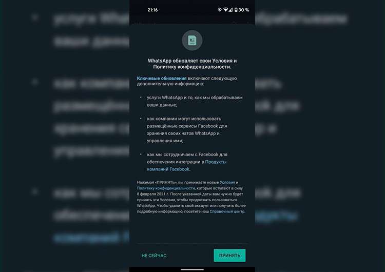 Отказаться от новых правил нельзя, в противном случае доступ к мессенджеру будет заблокирован. На фоне обещаний Марка Цукерберга при покупке WhatsApp, который утверждал, что пользовательская приватность останется неприкосновенной, такой поворот событий выглядит как плевок в лицо на пользователей.