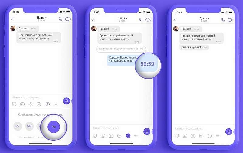 Они автоматически удаляются из переписки (и у вас, и у собеседника или из общего чата) через выбранное время. Актуально, если вы хотите отправить какую-то важную/личную инфу, которую затем надо удалить из переписки. Например — номер банковской карты, рассказ о вчерашнем смешном случае в баре, или крик души о начальнике.