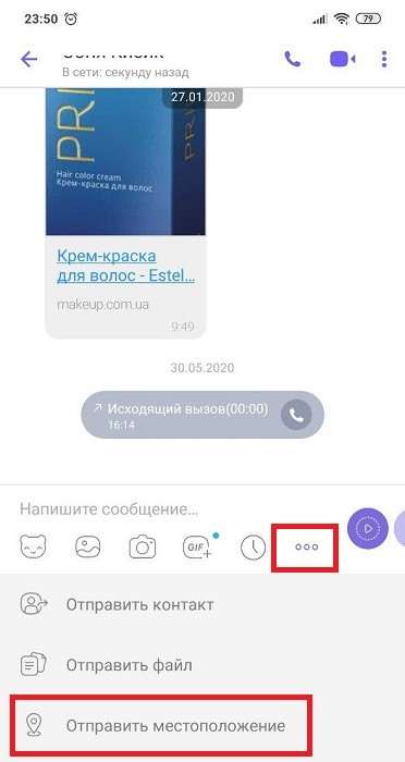 Для отправки рядом с полем ввода текста нажмите три точки, и выберите Отправить местоположение.
