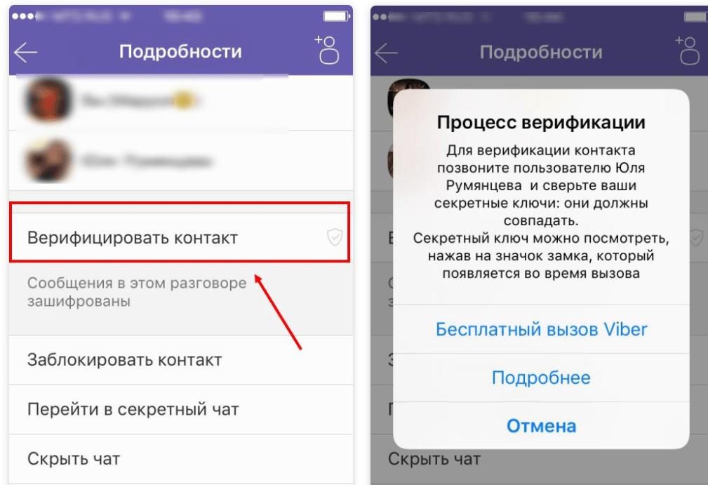 Для включения надо открыть нужный чат, нажать на имя контакта, выбрать Настройки — Верифицировать контакт (или смахнуть влево, и выбрать Верифицировать контакт, если у вас iPhone). Дальше — звоним собеседнику (Бесплатный вызов Viber), и жмем значок с замком внизу экрана. Ваш собеседник должен сделать то же самое.