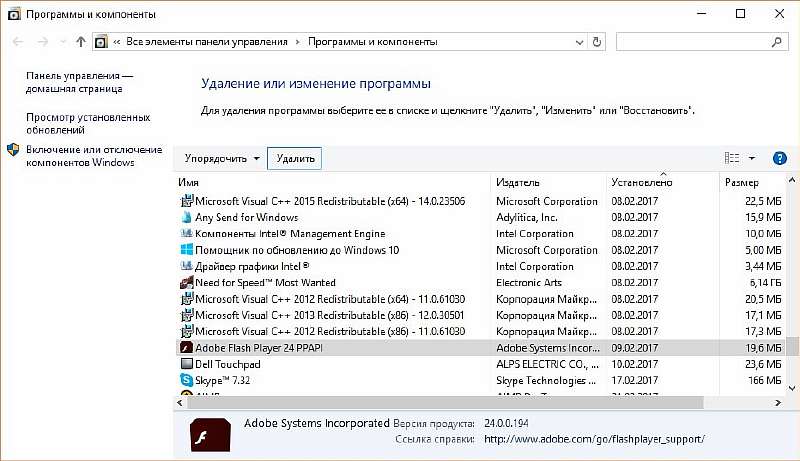 Далее найдите в списке Adobe Flash Player, выберите его, нажмите «Удалить» и подтвердите процесс деинсталляции.