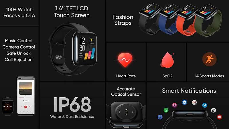 Realme Watch получили PPG-датчик для непрерывного мониторинга сердечного ритма и сенсор SpO2, который измеряет уровень кислорода в крови. Есть функция отслеживания сна, напоминания о необходимости разминки и соблюдении питьевого режима. Также часы поддерживают 14 режимов тренировок, среди которых них почему-то нет плавания, что странно, поскольку их корпус защищен от пыли и влаги по стандарту IP68.