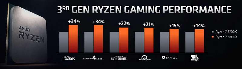 AMD сравнила производительность Ryzen 2700X и Ryzen 3800X, во всех актуальных играх новая модель обходит предшественника на 14-34%.