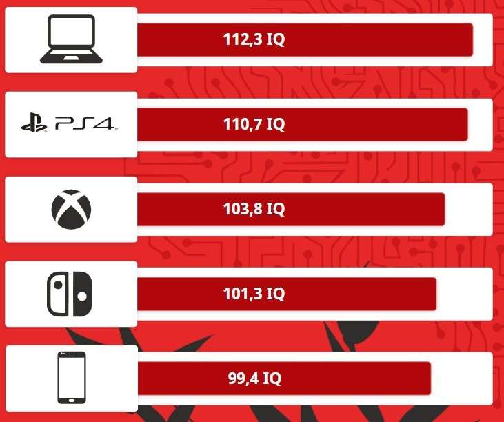 Также проверке поддались геймеры. Оказалось, что самые умные игроки предпочитают в качестве платформы ПК, их средний IQ составил 112.3. Второе место досталось фанатам PlayStation – 110.7, а замкнули тройку игроки на Xbox — 103.8. Самый низкий iQ оказался у любителей играть на смартфонах — 99.4 балла.