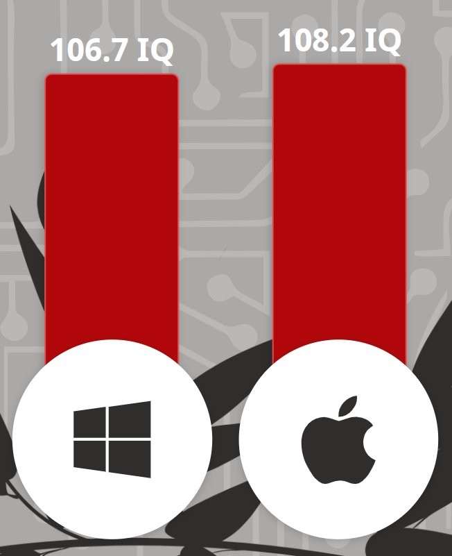 При этом владельцы компьютеров Mac в среднем оказались умнее пользователей Windows. Правда, такие результаты можно объяснить тем, что круг последних намного больше (соотношение 1:6) — это дает сильный разброс в итоговых результатах теста.