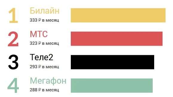 Второй интересный показатель — это средняя сумма, которую платят абоненты того или иного мобильного оператора каждый месяц. И здесь снова «Билайн» вырвался в лидеры с отрицательным знаком. Абоненты «полосатого» оператора вынуждены платить больше остальных — 333 рубля в среднем ежемесячно.