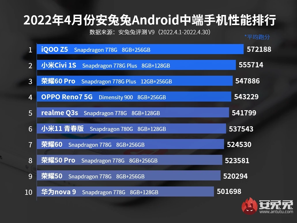 В среднем классе гегемония Snapdragon продолжилась. Девять из десяти моделей идут с чипсетом Snapdragon 778G и только OPPO Reno 7 5G с четвертого места оснащен Dimensity 900. Первые три места заняли iQOO Z5 (572 188 баллов), Xiaomi Civi 1S (557 714 баллов) и Honor 60 Pro (547 886 баллов). Также в десятку вошли realme Q3s, Xiaomi 11 Lite 5G, Honor 60, Honor 50 Pro, Honor 50 и Huawei Nova 9.