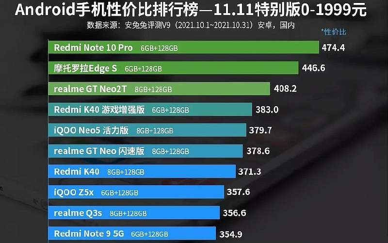Рейтинг бюджетников до 1 999 юаней (~22 000 рублей), с солидным отрывом от второго места возглавил Redmi Note 10 Pro – самый дешевый аппарат на рынке со 120-герцовым AMOLED дисплеем. Вместе с ним на пьедестале оказались Motorola Edge S и Realme GT Neo 2T.
