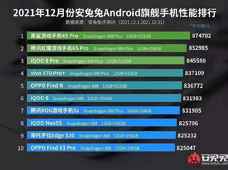 Изменений по сравнению с ноябрьским списком очень мало: первые три места остались те же самые, на строчку выше поднялся Vivo X70 Pro+, также в список лидеров попали OPPO Find N, iQOO Neo 5S и Moto Edge S30, заменившие Black Shark 4 Pro, Meizu 18 Pro и OnePlus 9 Pro соответственно. Все эти девайсы работают на чипе Snapdragon 888.