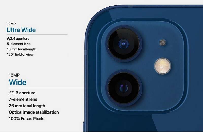 iPhone 12 получил двойную камеру на 12+12 МП с широкоугольным и ультраширокоугольным модулем. Apple рассказала, что заметно улучшила качество снимков на ультраширик и добавила ему поддержку ночного режима, а также возможность создавать таймлапсы при низкой освещенности.