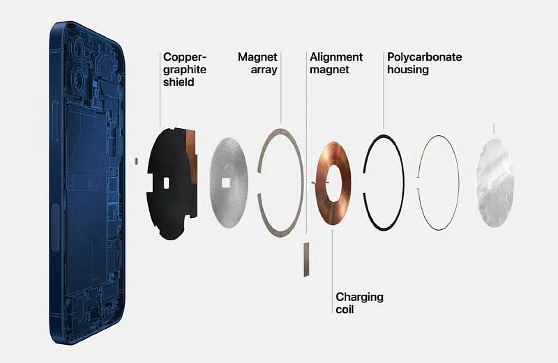 Смартфон поддерживает MagSafe – внутрь корпуса встроен круглый магнит, который упрощает установку девайса на беспроводную зарядку и позволяет крепить к нему чехлы и другие аксессуары, вроде кошелька для кредитных кард. Как и раньше iPhone 12 имеет стереодинамики, влагозащиту IP68 и NFC.