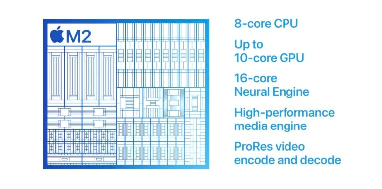 Самым большим обновлением внутри стал новый процессор Apple M2. Он разработан с учетом увеличения мощности и энергоэффективности. Построенный по технологии 5-нанометрового техпроцесса, М2 имеет 20 миллиардов транзисторов, что на 25% больше предшественника. Новые чипы получили 8 основных ядер (4 для мощных задач, и еще 4 «слабых» ядра), 8- или 10-ядерную графику и 16-ядерный Neural Engine. Все это будет работать максимально тихо с пассивным охлаждением.