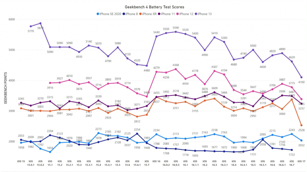 Он собрал вместе несколько смартфонов бренда — iPhone SE 2 2020 года, iPhone XR, iPhone 11, iPhone 12 и iPhone 13 — установил один и тот же уровень яркости и запустил на каждом бенчмарк Geekbench, который имитирует работу ресурсоемких приложений. Итоги получились неутешительные: