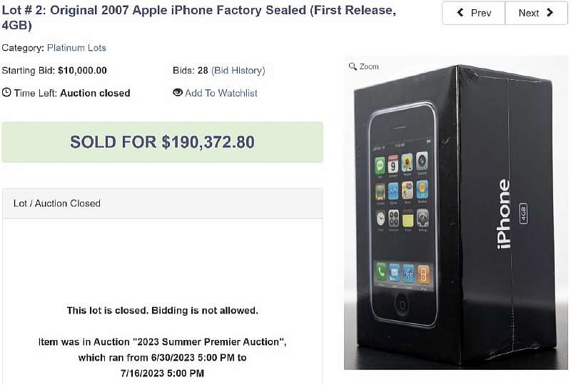 Несколько недель назад на аукционе LCG в США появилось предложение с оригинальным iPhone 2007 года выпуска. Запрашиваемая цена составляла 10 тысяч долларов, торги стартовали 30 июня и завершились 16 июля. Более чем за две недели ставки сделали 28 претендентов, и наконец смартфон ушел «с молотка» за 190 372 доллара. Это в три раза больше, чем предыдущий рекорд, который составлял 63 356$.