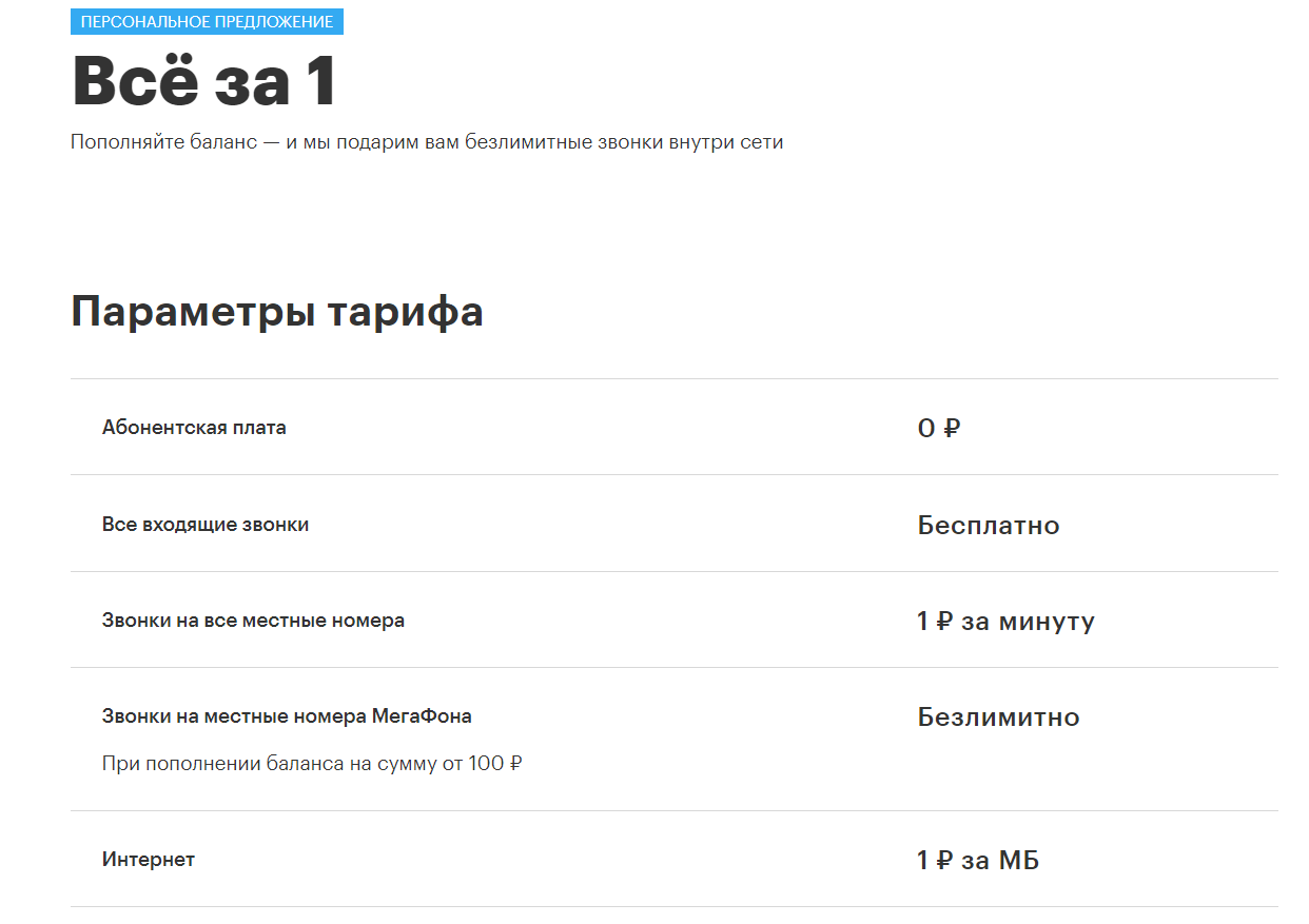 Тарифный план «Все за 1» полностью соответствует своему названию. При отсутствии абонентской платы клиент получает полный набор услуг, каждая из которых стоит ровно 1 рубль. В рубль обойдется минута разговора при звонках на местные номера, SMS сообщение, а также каждый мегабайт интернет-трафика.