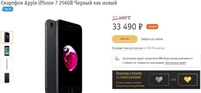 Если вы согласны с такими доводами, поспешите на акцию от Билайн: в магазине оператора отдают iPhone 7 256 ГБ «как новый» всего за 33 490 рублей – это среднерыночная цена семерки на 32 ГБ, так что скидка очень неплохая.