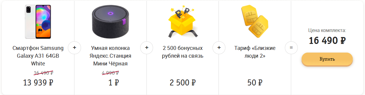Вся выгода заключается в бонусах: к Galaxy A31 за 16.5 кэсов Билайн добавляет подарком Яндекс.Станцию Мини (отдельно такая колонка стоит 5к) и возвращает 2500 рублей на связь. Новым абонентам предлагается один из тарифных планов линейки «Близкие люди» — это реально выгодные тарифы в текущих реалиях, подробнее о них мы рассказывали в этой статье.