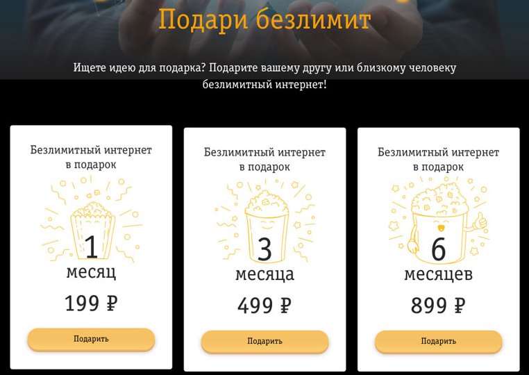 Оператор сотовой связи Билайн запустил новую услугу «Подари безлимит». Опция позволяет самостоятельно оплачивать тариф за другого человека, тем самым предоставляя ему возможность бесплатно пользоваться мобильным интернетом.