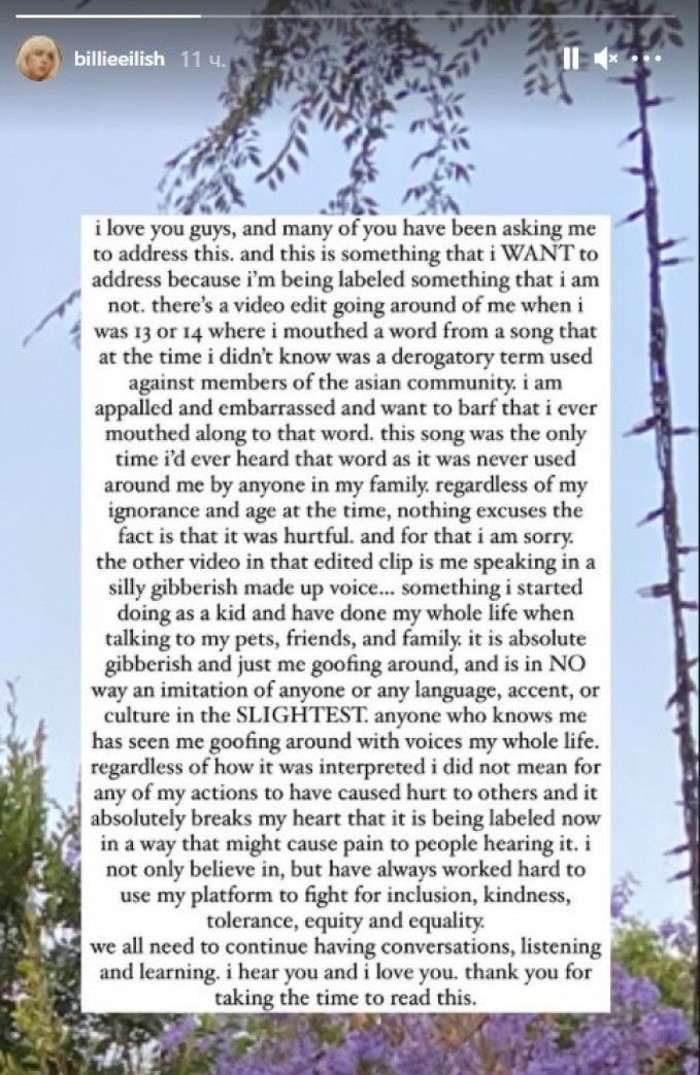 «Я сказала слово из песни, оскорбляющей достоинство людей азиатских национальностей. В тот момент я даже не догадывалась об этом. Мне очень стыдно за свой поступок. Эта песня – единственный раз, когда я когда-либо слышала это слово, потому что никто из моей семьи никогда не использовал его. Независимо от невежества и возраста в то время, ничто не извиняет того факта, что это было больно. И за это мне очень жаль», – написала Билли.