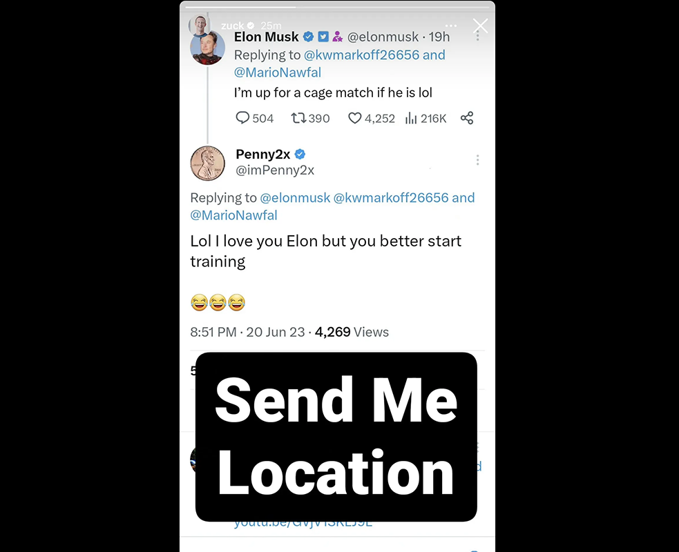 Илон Маск снова решил хайпонуть. На этот раз по-крупному. Глава Tesla и SpaceX написал в Twitter , что «готов к бою в клетке против Марка Цукерберга». Реакция последнего не заставила должно ждать, Цукерберг опубликовал скриншот поста с призовом «Отправь мне местонахождение», на что Маск ответил: «Вегас. Октагон».