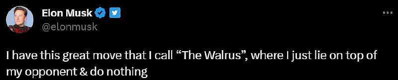 Илон Маск уже раскрыл свой секретный прием, который, вероятно, готовится применить в клетке: «У меня есть прекрасное движение, которое называется «Морж». Это когда я просто ложусь на соперника и ничего не делаю», – написал Маск в одном из последних твитов.