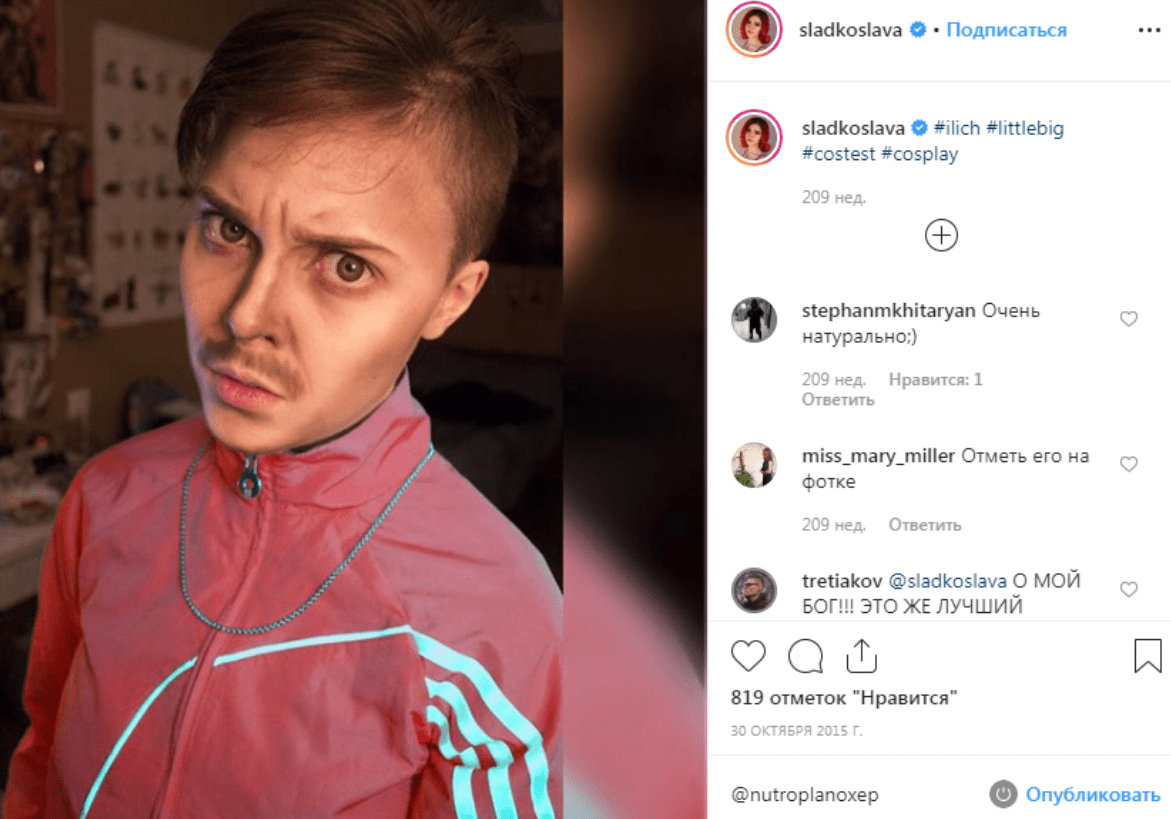 Но, кажется, косплей героинь — это недостаточно сложный челлендж для Сладкославы, поэтому время от времени она перевоплощается и в мужских персонажей. Среди реализованных проектов Джокер в исполнении Джареда Лето, жутковатый клоун из «Оно» и, внезапно, солист группы Little Big Илья Прусикин. Последний получился особенно впечатляющим. Его оценил даже сам Прусикин и очень удивился, что кто-то настолько умело пользуется гримом.