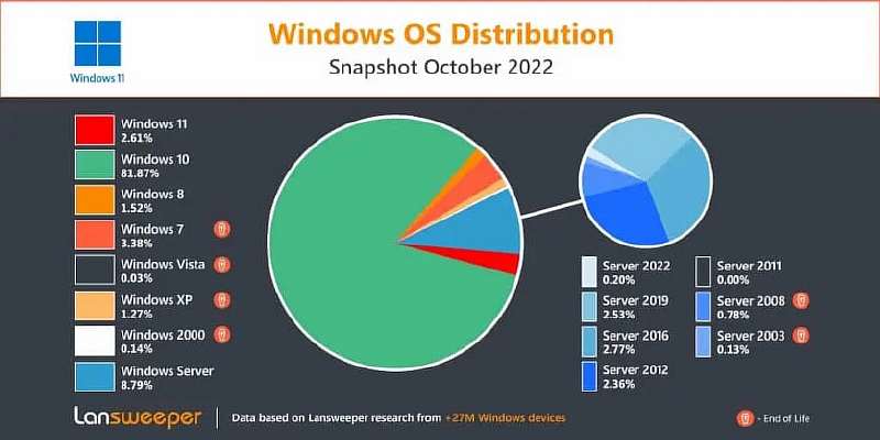 Компания Lansweeper поделилась интересной статистикой, собранной с 27 миллионов рабочих компьютеров на Windows. Из них на долю последней версии ОС пришлась лишь малая часть, всего 2.61%. Как выяснилось, целых 42% пользователей столкнулись с проблемой, которая мешает им обновиться — аппаратная несовместимость.
