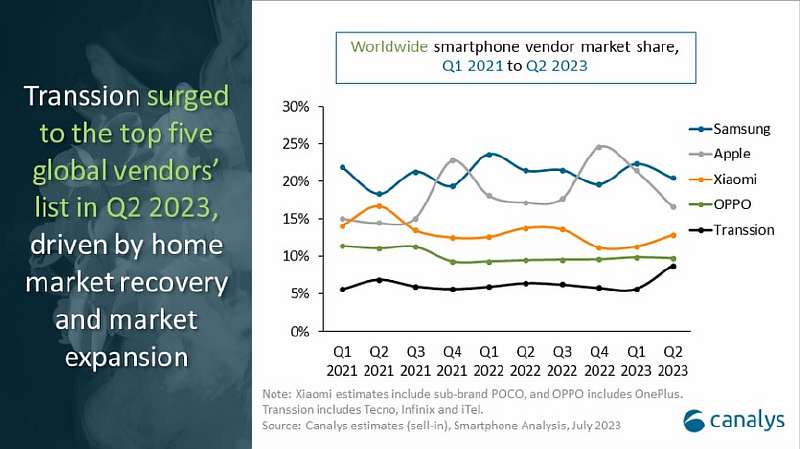 Согласно последнему отчету, пятым крупнейшим производителем телефонов в мире стала корпорация Transsion. Продав 22.7 миллиона устройств за второй квартал 2023 года, этот относительно новый игрок сумел завоевать долю в 9% рынка. Transsion стоит за брендами iTel, Infinix и TECNO, чьи смартфоны сейчас очень неплохи по соотношению цены и характеристик. Концерну удалось потеснить Vivo, которая проигрывает суды и вынуждена сворачивать продажи в некоторых странах Европы в результате патентного спора с Nokia.