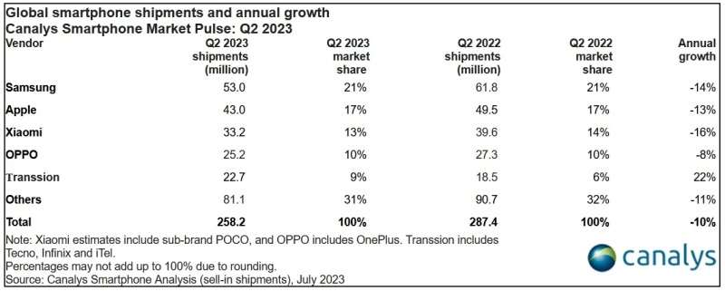 В целом мировые продажи смартфонов за второй квартал 2023 года составили 258.2 млн единиц , что на 10% меньше, чем в прошлом году (тогда было продано 287.4 млн устройств). Однако рынок, похоже, медленно восстанавливается. «Спад индустрии смартфонов снова замедлился благодаря сокращению запасов в масштабах всей отрасли и восстановлению спроса на рынках развивающихся стран», – говорит аналитик Canalys Эмбер Лю.