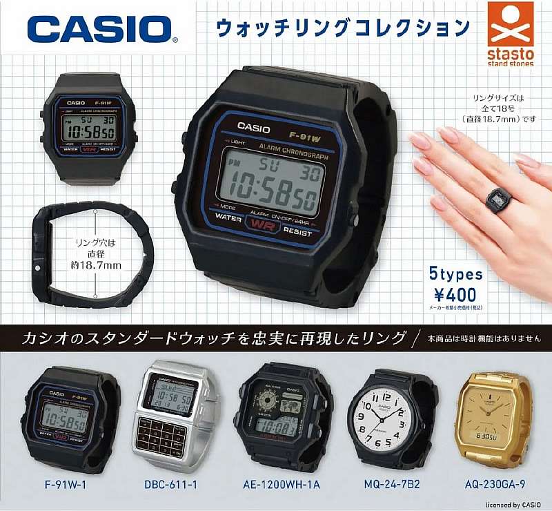 На выбор доступны полностью цифровые F-91W-1, часы-калькулятор DBC-611-1, часы с мировым временем AE-1200WH-1A, аналоговые MQ-24-7B2 и аналого-цифровые AQ-230GА-9. Их дисплеи имеют трехслойную структуру для более реалистичного внешнего вида, а ремешок можно отрегулировать по размеру пальцев, но сами часы нефункциональны.