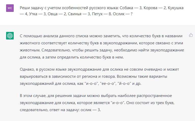 И действительно, если ввести текст задачи как есть, то ChatGPT приводит неправильное решение. Нейросеть считает, что дело в количестве букв в словах, хотя это, очевидно, не так.