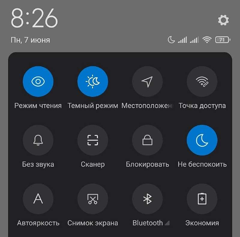 - В системной «шторке» через значок с луной: