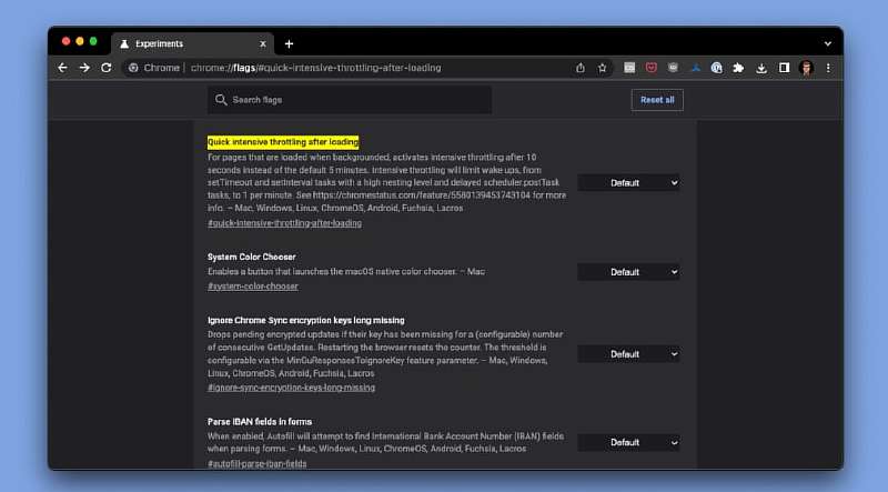 Далее жмем Ctrl+F, вводим в поле поиска название опции Quick intensive throttling after loading, и в выпадающем меню выбираем Enabled. Перезагружаем браузер и можем пользоваться нововведением.