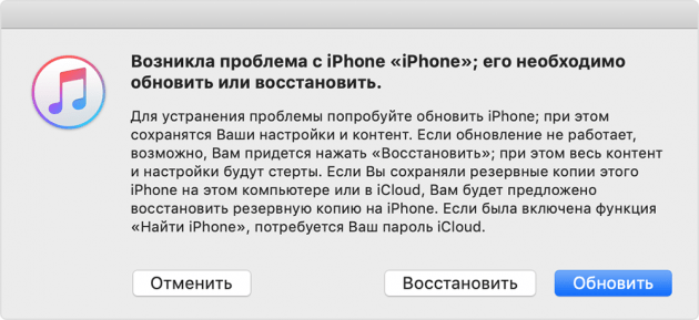 - На экране компьютера появится окно, в котором можно выбрать между обновлением iPhone и его восстановлением. Нам, в данном случае, нужна кнопочка «Восстановить».