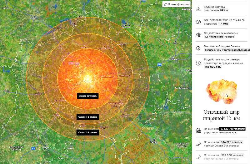 Например, если бы в центре Москвы упала комета диаметром 500 м, скоростью 17 км/с и углом наклона 45 градусов, она образовала бы кратер шириной 9,7 км, выделив энергию, эквивалентную 12 гигатоннам тротила – это больше, чем у всех существующих атомных бомб в мире. Только от удара погибло бы 636 170 человек, а с учетом взрывной волны – 6.4 млн человек.