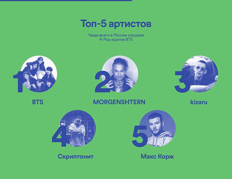 Многих это удивит, но звание самого популярного исполнителя досталось не одному из хайповых рэперов, а корейской группе BTS. Фанаток кей-попа в Spotify явно больше, чем можно было себе представить. А вот на второй строчке как раз рэпер и кумир современной молодежи — MORGENSTERN. На третьем и четвертом месте еще два рэпера — Kizaru и Скриптонит, а замыкает пятерку лидеров белорус Макс Корж.