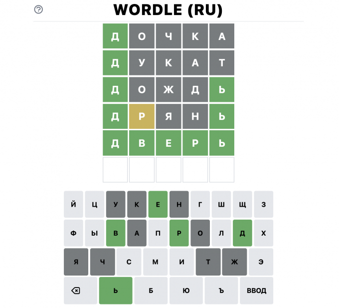 Все очень просто. Раз в день пользователю выдают неизвестное слово, состоящее из пяти букв. У игрока есть шесть попыток его отгадать, первая попытка выглядит как тычок пальцем в небо – вы вписываете просто любое слово, которое подходит по размеру. Когда выбор сделан, буквы получают цветовое сопровождение – зеленые верны и находятся на своем месте, желтые в слове есть, но не там где вы предположили, серых же нет вовсе.