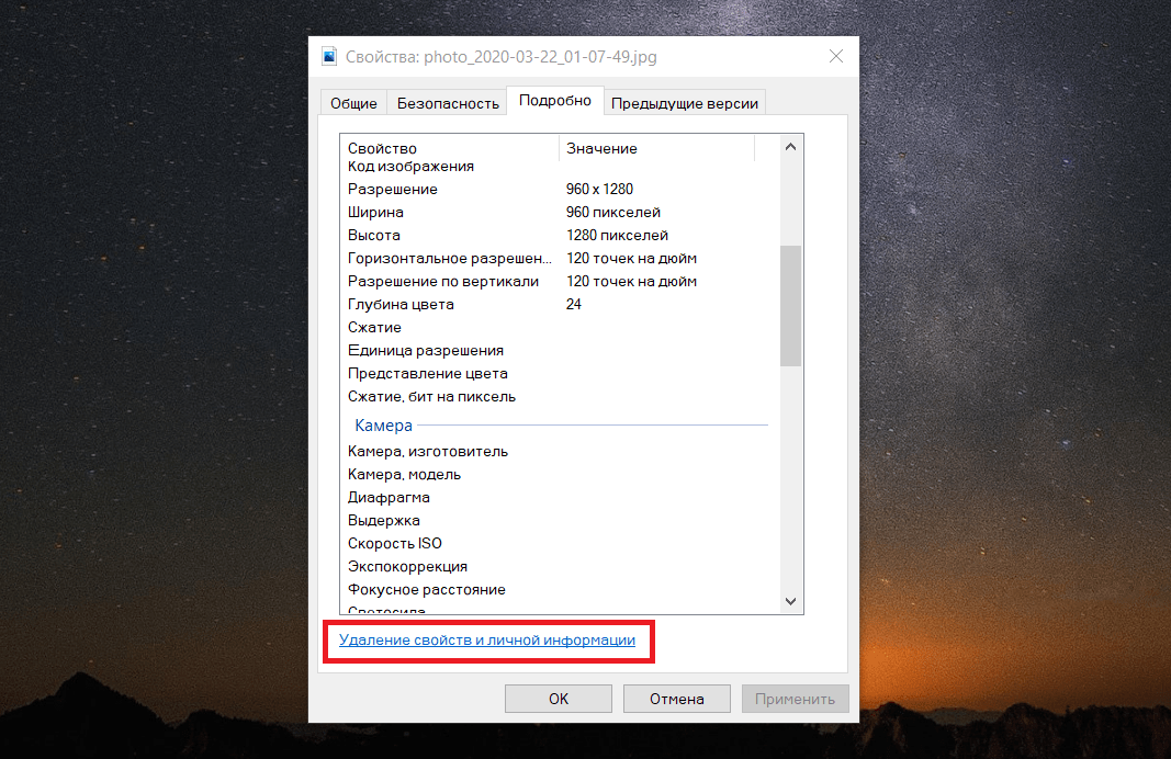 - Здесь и отображается вся информация из EXIF. Чтобы ее стереть, нужно нажать на «Удаление свойств и личной информации» снизу. Можно удалить как все сразу, так и отдельные пункты на выбор.