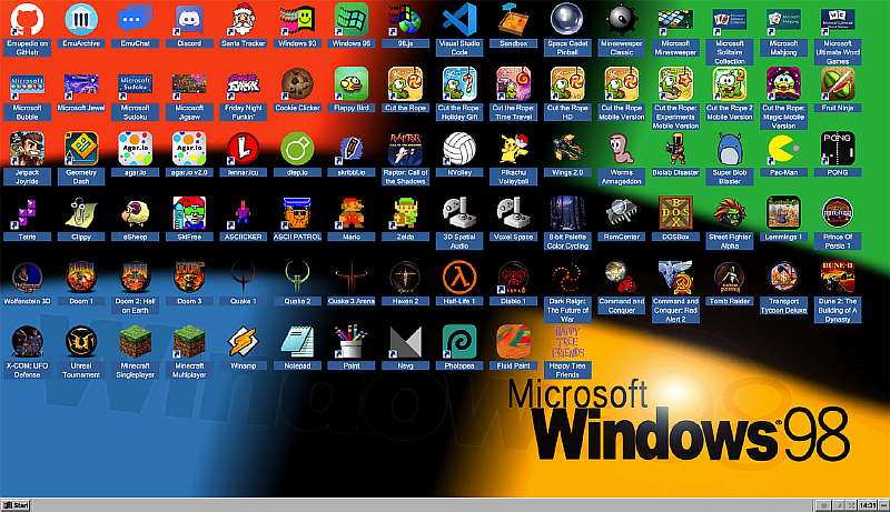 Ну а для тех, кому одних старых игр мало, есть вариант более глубокого погружения в прошлое — это полноценный браузерный эмулятор операционных систем Windows 95, 98 и Me. С загрузкой, рабочим столом и навевающими ностальгию звуками. На рабочем столе куча ярлыков с работающими программами и играми, от Worms до Wolfenstein. Любую из них можно запустить.