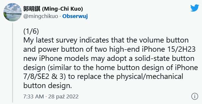 Айфоны в следующем году будут существенно отличаться от нынешних моделей — по крайней мере, в одном аспекте. Согласно сообщениям уважаемого информатора, Минг-Чи Куо, iPhone 15 Pro и 15 Pro Max выйдут без физических кнопок. Вместо традиционной «качельки громкости» и клавиши включения с четким тактильным откликом, будут использоваться вибромоторчики, встроенные в корпус, напоминающие кнопку Home из старых моделей iPhone.