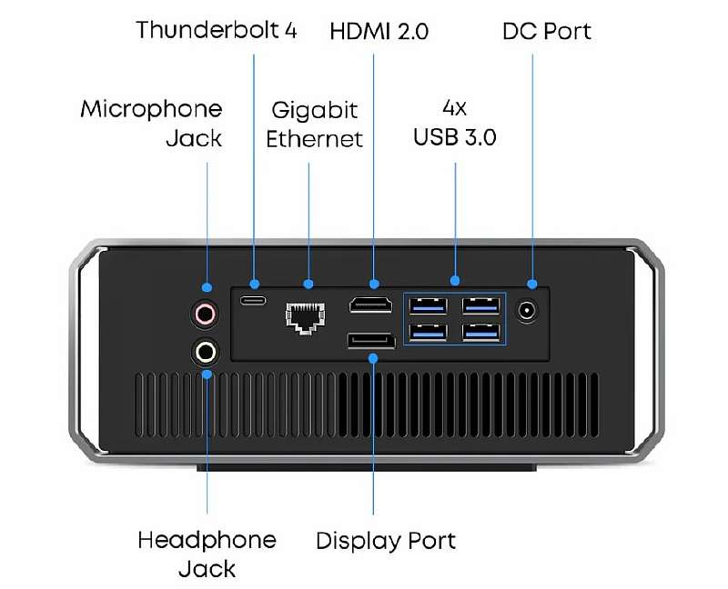 CHUWI CoreBox оснащен полным набором разъемов: HDMI, DisplayPort, Thunderbolt 4 (!), а также Ethernet, 4x USB-A и аудиовыходом 3,5 мм. Это позволяет подключить до трех мониторов 4K 60 Гц, а при необходимости даже внешнюю карту eGPU. Также имеется возможность работы с WiFi 6 (802.11ax) благодаря карте Intel AX201 .