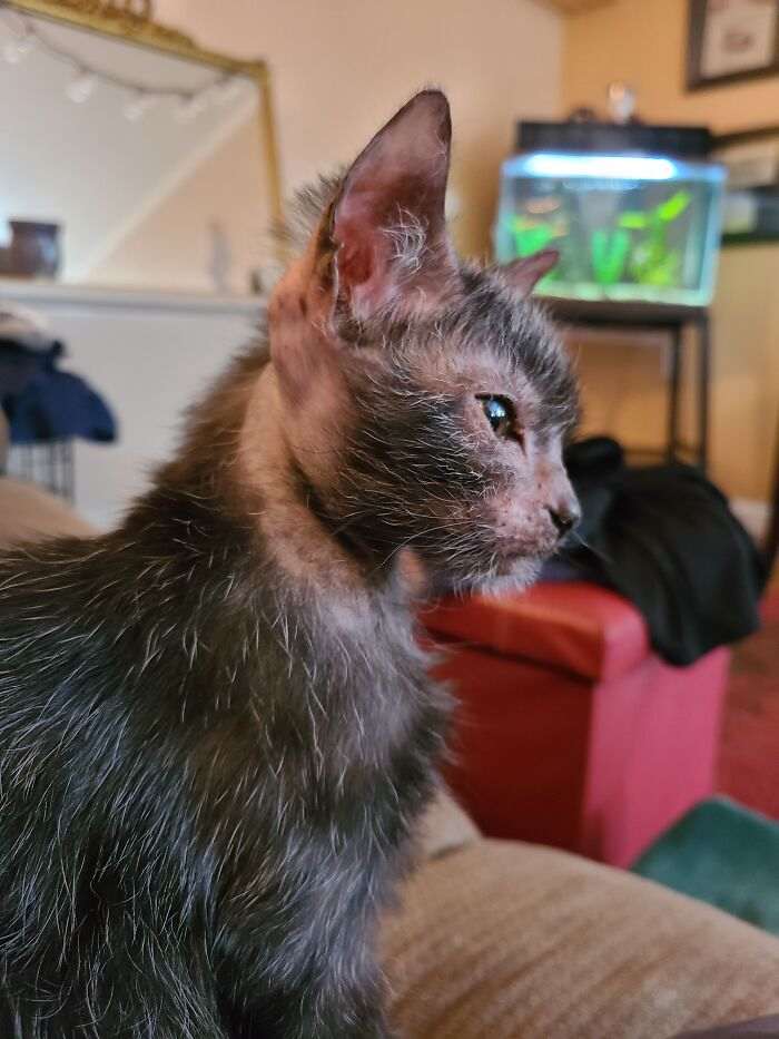 Пока Грейси росла, хозяйка не спускала с нее глаз, беспокоясь о здоровье. К тому времени котенок снова частично оброс шерстью, но какой-то странной. Грейси по-прежнему очень сильно отличалась от своих родных братьев и сестер. Так как Бри — фотограф по профессии, она часто фотографировала Грейси, чтобы запечатлеть ее уникальность на память.