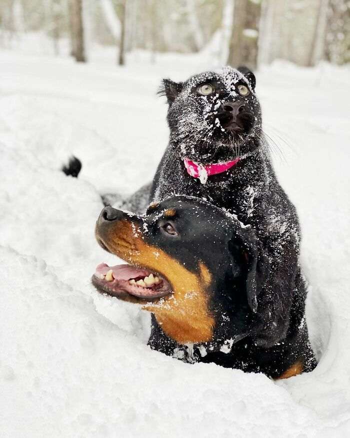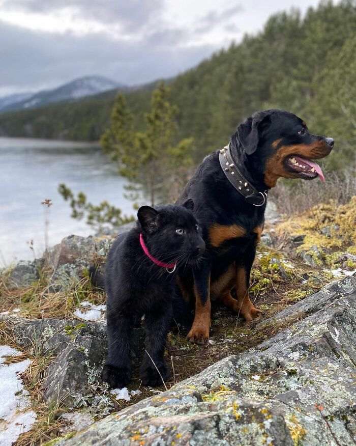 Компанию черной пантере в Викином доме составляет огромный и не менее черный ротвейлер по кличке Венза — они отлично поладили между собой.