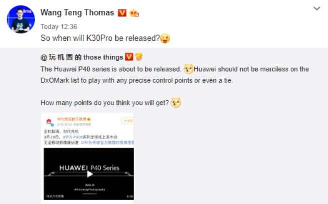 Ван Тэн оставил комментарий к посту компании Huawei о грядущем релизе семейства Huawei P40 в соцсети Weibo. Он задался риторическим вопросом, когда же выйдет Redmi K30 Pro. Поскольку подобные посты руководители Xiaomi никогда не публикуют просто так, можно сделать вывод, что новинки будут представлены примерно в одно время. Презентация Huawei P40 состоится уже 26 марта.