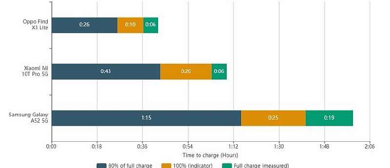 Не в восторге эксперты DxOMark оказались только от скорости зарядки Samsung Galaxy A52. Телефон поставляется в комплекте с 15-ваттным адаптером, который полностью заряжает АКБ за 1 час 50 минут – по современным меркам это медленно.