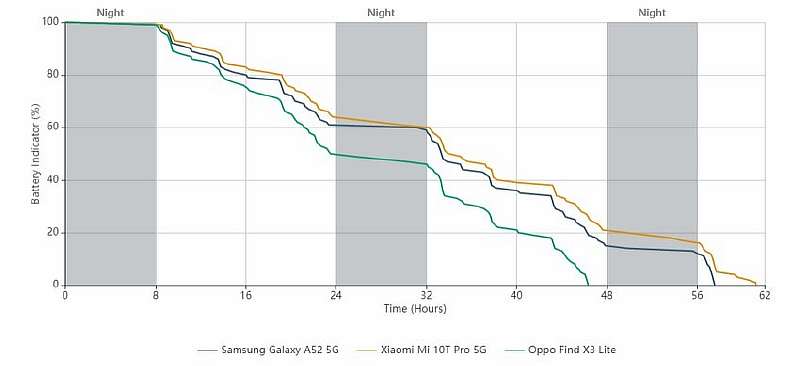 За одну ночь в режиме ожидания Galaxy A52 разряжается всего на 1.33%. Для сравнения: Xiaomi Mi 10T Pro и OPPO Find X3 Lite за аналогичный период теряют 2% заряда. Обошёл конкурентов корейский смарт и по энергозатратам в режиме вызовов, при просмотре видео и прослушивания музыки с LTE-подключением. А вот во время игровых сессий и потреблении видеоконтента через Wi-Fi он разряжается немного быстрее конкурентов.