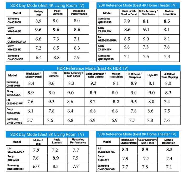 Среди испытуемых были следующие телевизоры с 4К разрешением: LG G2 Gallery (OLED), Samsung QN95B (mini-LED), Samsung S95B (mini-LED на квантовых точках), Sony XR-A95K (QD-OLED), Sony XR-A95K (mini-LED), а также несколько 8К-моделей: LG Z2 (OLED), Samsung QN900B (mini-LED на квантовых точках) и Sony XR-Z9K (mini-LED).