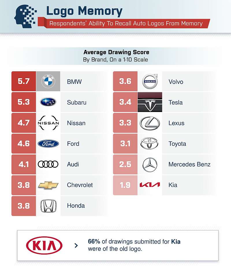 По итогам логотипы BMW, Subaru, Nissan, Ford и Audi врезались людям в память лучше всего. А хуже прочих дела обстояли у KIA. Mercedes-Benz, Toyota, Lexus, Tesla. KIA вообще возглавила антирейтинг — бренд просто сменил логотип, а большая часть респондентов рисовала старый.