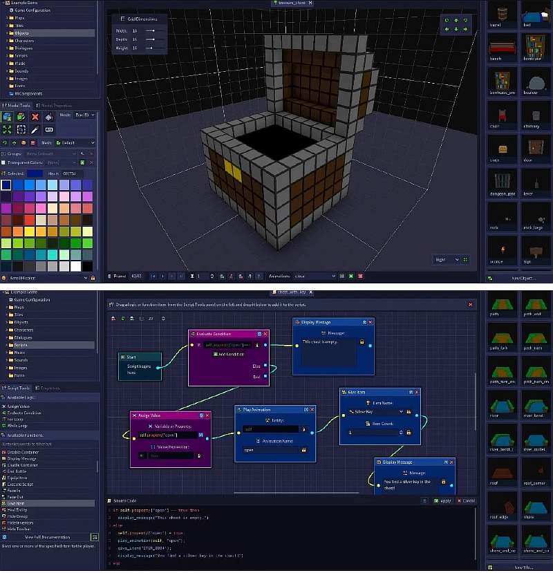 Графика в RPG in a Box не очень, но, с другой стороны, он не про красивую картинку. Здесь вы сможете познакомиться с механикой создания игр, научиться программировать элементы окружения и NPC-персонажей. Настроить то, как они будут работать и взаимодействовать друг с другом.